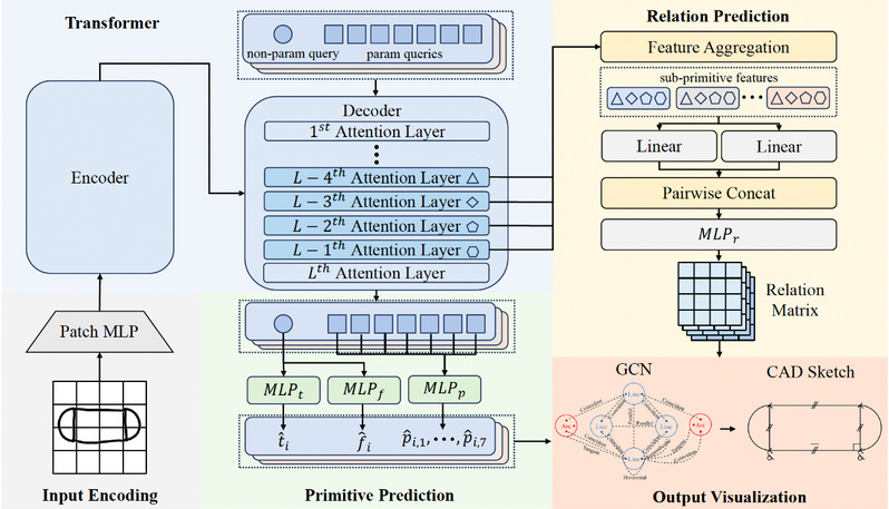现代工业设计依赖于参数化CAD模型,这些模型通常起始于包含几何基元与约束的二维草图。传统的CAD草图建模过程依赖于专业软件与复杂的人机鼠标交互,学习成本高、设计周期长。利用人工智能方法将手绘图或渲染图转化为CAD草图,有望简化并加速设计流程。现有方法侧重于基元与约束的分别学习,通常采用两阶段方法或可学习的token来独立建模,忽视两者间的内在联系,在较复杂场景下存在局限。